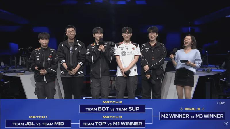 这个季前赛也非常有意思,上中下野辅分为五队,分开对抗,首轮:打野队 vs 中单队;次轮 下路队 vs 辅助队;上单队 vs 打野队/中单队(胜者);决赛:次轮两场比赛的胜者,最后的胜者为冠军。因此Faker,Zues,Gumayusi,Chovy等知名选手,均参与了此次季前赛。